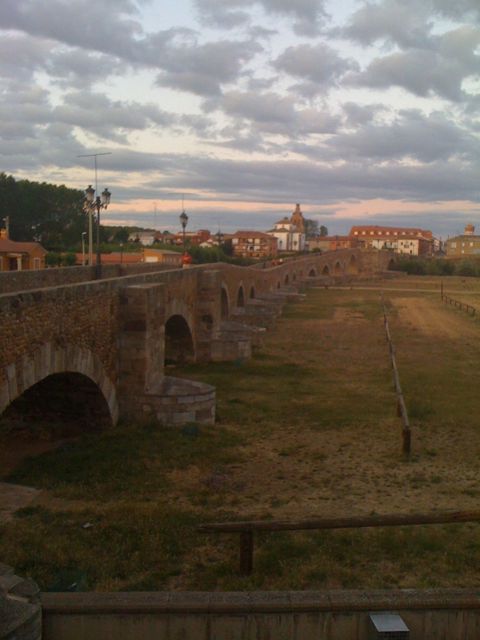 Después de 115 kilómetros y de 7 horas y 31 minutos de pedaleo hemos llegado a Hospital de Órbigo. El Camino se nos ha hecho muy largo, sobre todo los últimos 20 kilómetros, que al igual que ayer, han tenido un tramo insufrible de camino muy pedregoso. Por lo demás todo tranquilo, y sigo pensando que lo de León es impresentable, primero no se llega nunca, y una vez has llegado, no sales nunca. Además, el Camino que pasa por la ciudad de León recorre ciertos lugares que desmerecen su mística.